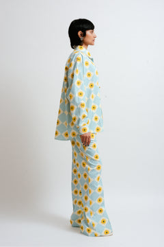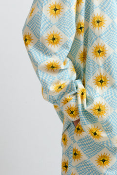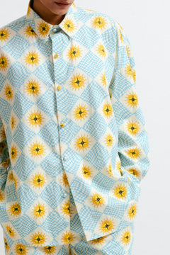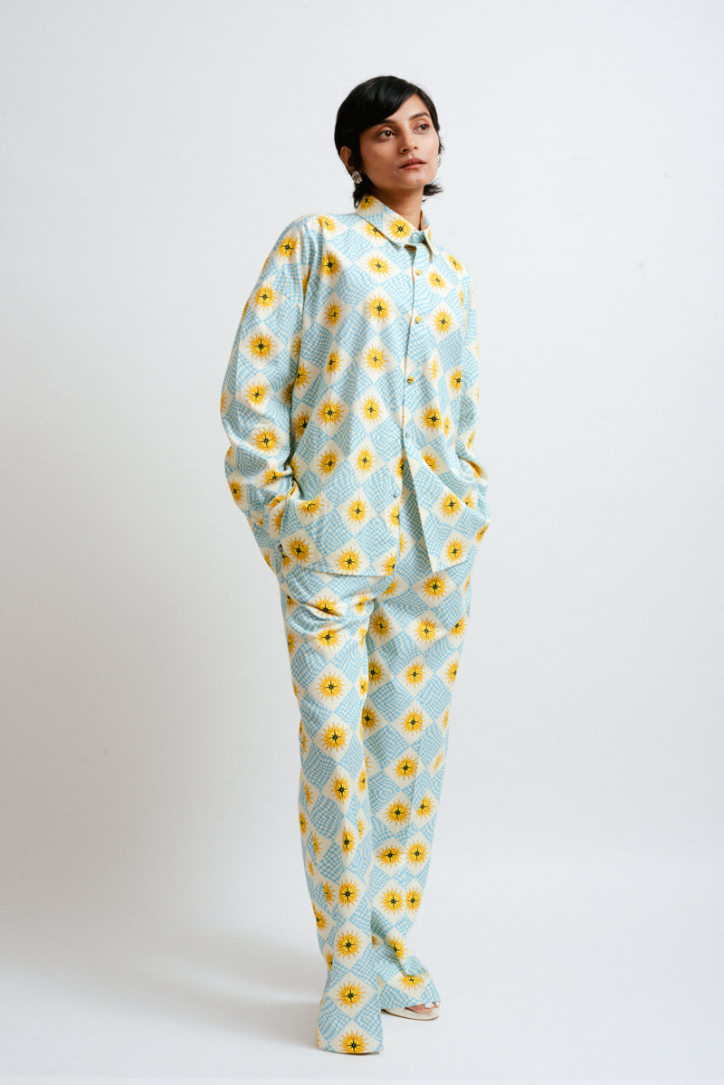Our “Astral Enigma Co-ord Set”, a classic shirt and trouser ensemble features an eye-catching astral inspired printed pattern, tailored for effortless style. The shirt boasts a relaxed silhouette, classic button down shirt with a straight hemline, complementing the straight-fit trousers for a harmonious look. Made from premium quality recycled Cotton fabric, offering a smooth texture and a luxurious feel against the skin.
