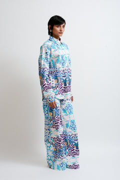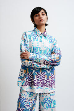 “Astral Mirage” Co-ord Set, crafted from high-quality, breathable recycled cotton fabric, this set features a printed shirt and matching trousers that exude effortless sophistication. The lightweight shirt boasts an intricate astral-inspired print, a classic collar, full sleeves, button down shirt and a relaxed fit, making it perfect for casual outings or chic evening wear. The coordinating straight fit trousers mirror the shirt's print, offering a tailored yet comfortable fit.
