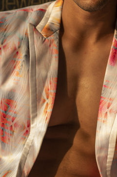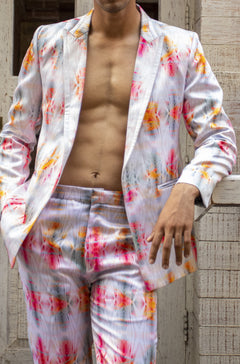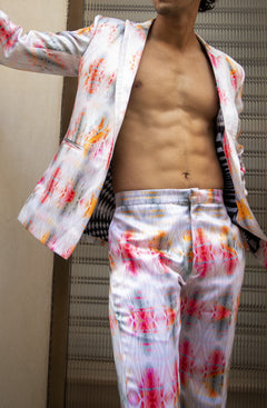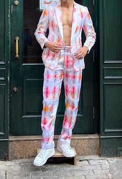 Our “Starfall Men's Set” featuring digital-printed oversized, structured fit, edgy jacket. Designed with a classic bold peak collar and satin detailing. The intricate starry digital print, adds a touch of whimsy and mystique. Crafted from premium materials for comfort and durability, this set is both a statement piece and a versatile layering option. This look consists of straight fit similar print trousers with side pockets.