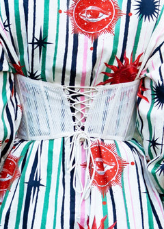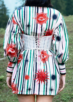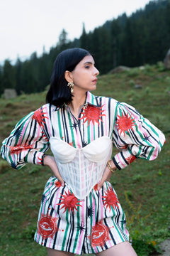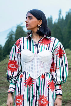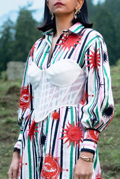 A study in structure and softness, The Lunar Corset brings a sense of quiet strength to the fluid world of Indriya: The Senses. Its clean lines and considered construction offer a modern take on a timeless silhouette, fitted through the body, yet adjustable to the wearer through its delicate back tie-up fastening. Meant to shape, support, and empower without restriction, The Lunar Corset invites an exploration of form, where structure becomes a vessel for confidence, and detail becomes a form of quiet self-expression. Worn layered or on its own, it offers versatility across seasons and moods. In keeping with Indriya’s philosophy, this piece speaks to awareness, of posture, of presence, of the subtle dialogue between body and garment. A reminder that strength can be soft, and structure can still leave space to breathe.