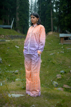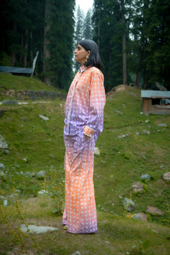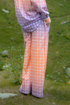 An expression of ease, versatility, and thoughtful design, The Twilight Trouser is crafted for those who appreciate everyday pieces elevated through subtle details. Made from soft, breathable recycled cotton, the set features a gentle ombre of lavender fading into soft orange, punctuated with delicate white star motifs, a quiet nod to cosmic transitions and changing skies. Straight-fit trousers featuring side pockets and an elasticated back waistband to balances structure with comfort, making it as suitable for slow mornings as for purposeful days.